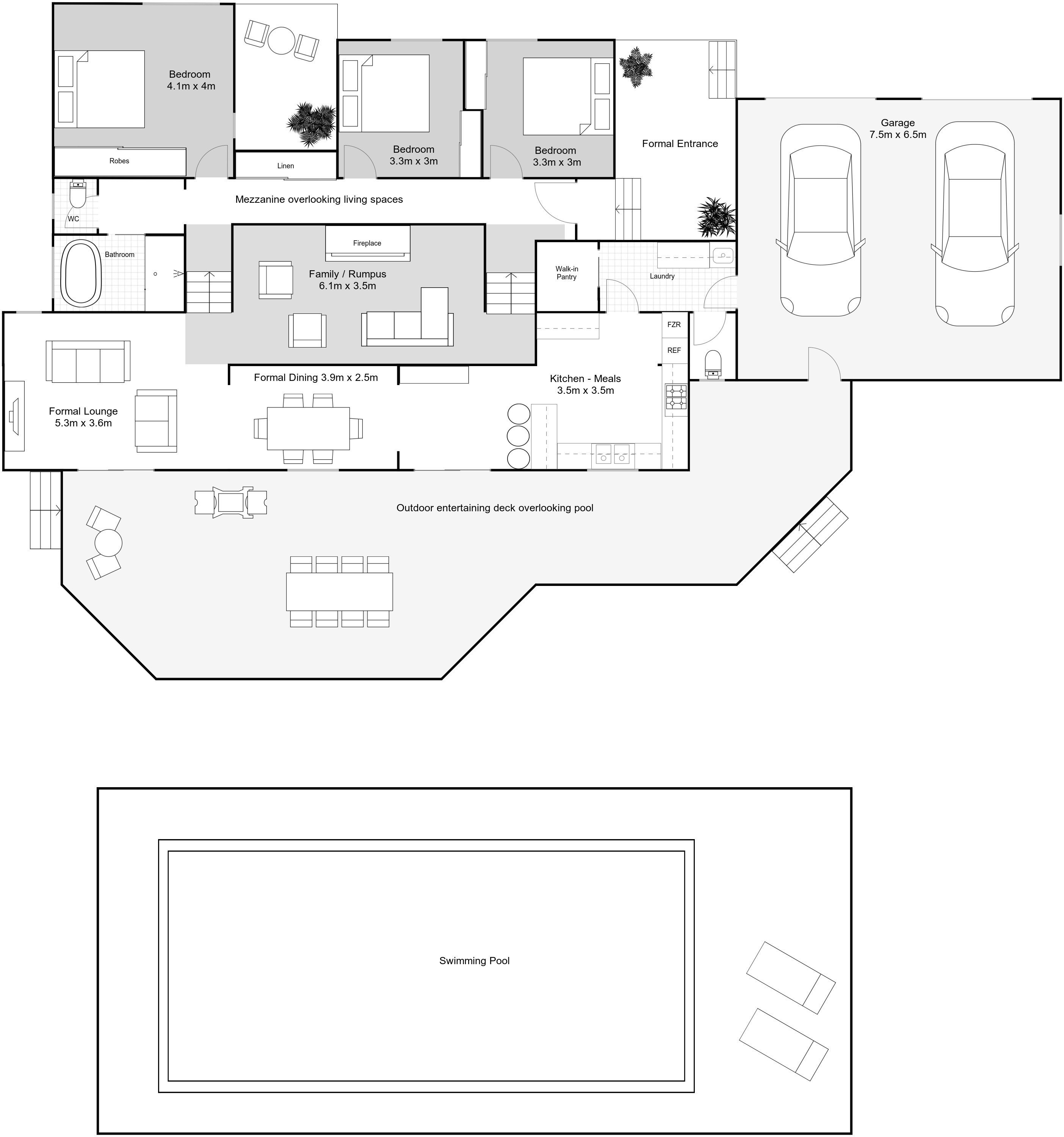 * Maintenance kept to a minimum with Modwood deck overlooking the pool and easy care gardens and yard.