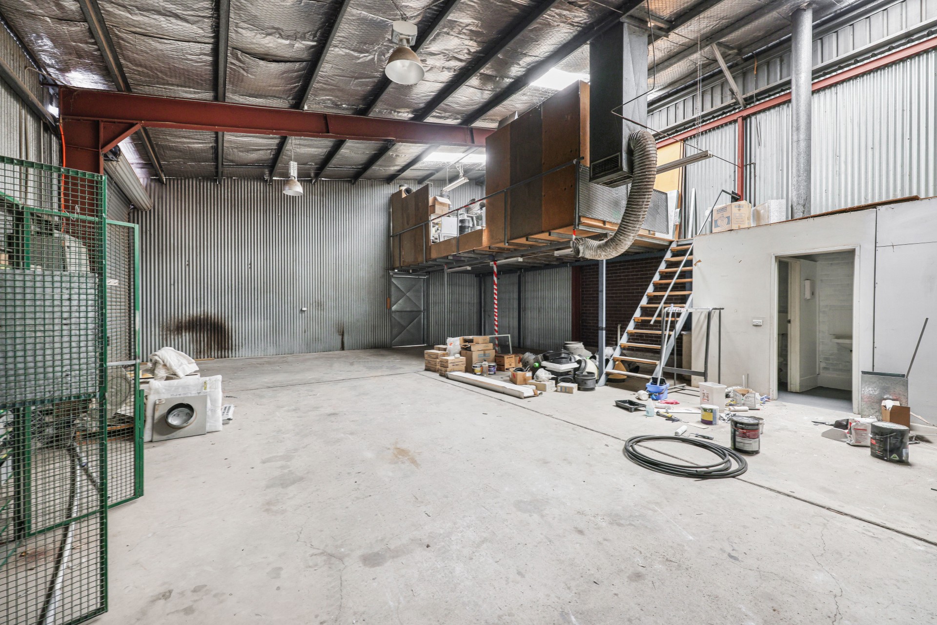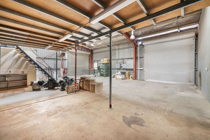 Two warehouse areas with large mezzanine storage space. Large industrial roller shutters on three sides.