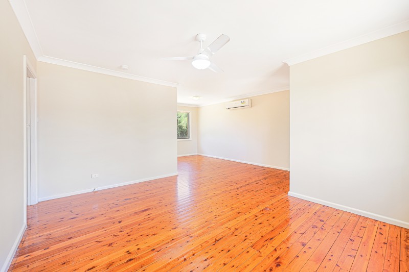 Inside, polished timber floorboards flow through the main living areas, adding warmth and character, while the bedrooms are carpeted for everyday comfort. The open living and dining zone is light-filled and well-proportioned, complete with reverse-cycle air conditioning to ensure year-round climate control.