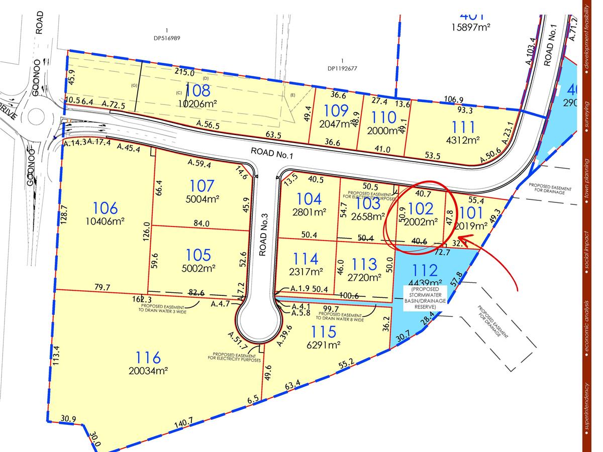 Lot 102 is strategically positioned on the main road through the Goonoo Goonoo Commercial Precinct, near the southern entrance, offering strong exposure and accessibility for a wide range of commercial, trade, or service-based operators.